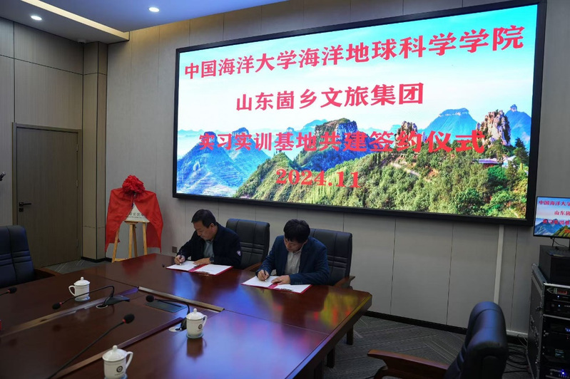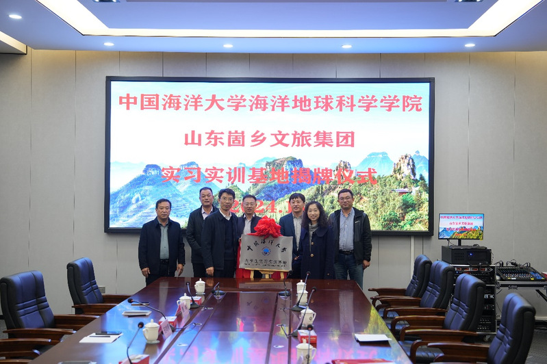 本站讯 11月15日,中国海洋大学海洋地球科学学院(以下简称“学院”)与山东崮乡文旅集团签署大学生实习实训基地合作协议并举行揭牌仪式。仪式在临沂大学乡村振兴学院举行,蒙阴县委副书记张亮,中国海洋大学省派第一书记贾林,岱崮镇党委宣统委员王均镇,山东崮乡文旅集团董事长曹兴刚,以及学院副院长毕乃双,学院党委副书记、副院长吴瑕,学院实验教学中心副主任刘明等出席仪式。